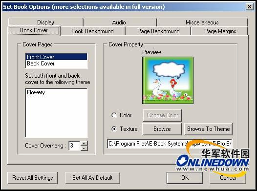 小提示:FlipAlbum默认只提供了一种相册页面模板,你也可以制作体现自己个性化的模板。可制作5张图片为相册5个地方做准备(分别为相册本下的背景、相册封面、相册里的页面、相册的次封底及相册的封底),并可在“安装盘符及目录\E-Book Systems\FlipAlbum 5 Pro Eval\Template\Theme”下创建一个新目录,并把这5张图片保存到该目录中。然后在FlipAlbum菜单中单击“Options→Set Book Options”打开设置窗,依次选择“Book Cover”、“Book Background”、“Page Background”标签通过“Browse”按钮进行图片选择设置(如图),而需注意的是在“Book Cover”需分别选择“Front Cover”及“Back Cover”进行图片设置,而在“Page Background”中,如相册照片模式设置为一页一照片,则需选择“Left Page”及“Right Page”进行设置,否则只需对“Centerfold Page”进行图片设置。