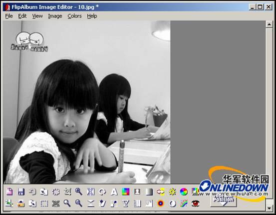 利用FlipAlbum还可对相册中的照片进行编辑处理。直接在照片上单击鼠标右键,从弹出的菜单中选择“Edit”命令便可打开编辑窗口,从下端的工具中选取相应工具,便可轻松地对照片进行处理,像常见的“去红眼”、“亮度调整”、“对比度调整”、“添加文字”等功能一个也不少,处理完成后单击“Save image”按钮即可保存处理后的照片并退出编辑窗口,返回FlipAlbum主窗口(如图)。