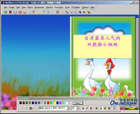 给相册中的照片添加一些文字说明或注释,可以使相册更趣味。在要添加标注的页面上空白处单击鼠标右键,在弹出的菜单中选择“Annotate(注释)”命令,在出现的“Annotate”工具栏上调整好文字的字体、字号、颜色等,然后再输入文字(如图10),完成后在空白处单击即可完成。而要修改已输入的文字,可在该文字上单击鼠标左键便可进行修改,利用这个方法还可以对相册封面的文字进行修改(如图)。