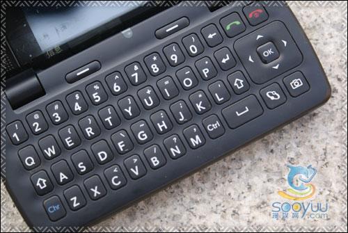侧翻盖里面的键盘是QWERTY全键盘,在键盘右下方位置是该机的主菜单键和拍照快捷键,键盘右侧还专门设置了方向键跟确定键。