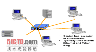 由于中央节点要与多机连接,线路较多,为便于集中连线,目前多采用一种成为集线器(HUB)或交换设备的硬件作为中央节点。目前一般网络环境都被设计成星型拓朴结构。星型网是目前广泛而又首选使用的网络拓朴设计之一。