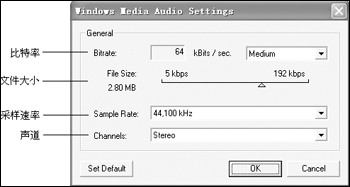 3)执行“Output→Settings”菜单命令,这时出现的“Windows Media Audio Settings”对话框允许我们对将要制作的WMA文件进行参数设定,如图2所示。