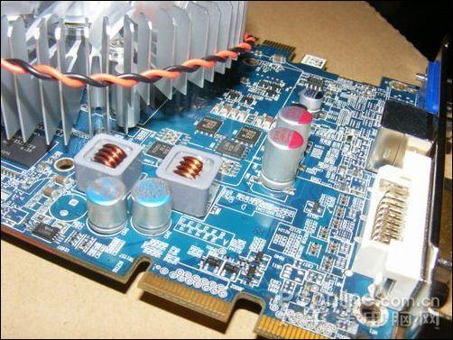 索泰 N9600GSO-512D3米格版采用2+1相分离式供电设计,采用全固态电容和全封闭式电感,另外提供6pin的电源接口。值得留意的是电容都划了线,证明经过质量检查。