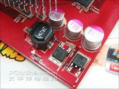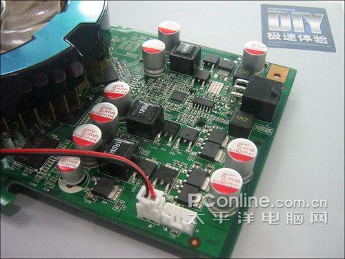 在供电方面,影驰 9600GT加强版采用了三相供电模块,用料上采用了日本化工优质固态电容,电气性能突出,加上全封闭R68电感,以及6pin外接电源接口,为显卡长期使用提供保障。同时还设计了独立的MOS管散热器来降低温度,提升显卡的超频潜力。