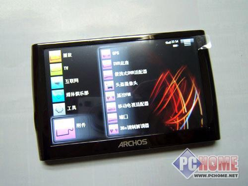 作为爱可视顶级的产品之一,ARCHOS 5在包装与附件上自然是不会寒酸,厚厚的说明书,擦镜布,耳机等自然是一应俱全。搭在底座上放置之后,ARCHOS 5显得霸气十足,外形尺寸为127.5×78.3×12.9毫米,重250克。配备了4.8英寸1600万色800×480像素分辨率TFT液晶显示屏,可触摸屏。充满电后可支持12小时音频播放或4小时视频播放。