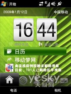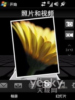 主界面还是我们很熟悉的TouchFlo 3D界面,当初Touch Diamond刚推出TouchFlo 3D界面的时候,可以说给人相当惊艳的感觉。用手指拖动屏幕下方的工具栏,便会出现大图标的显示,这时通过左右拖拉从而选择相应功能,如天气预报、短信界面、唱片、图像/录像浏览器和图像化的电子邮箱。凭借自身的重力感应器Pro也可以在打开全键盘时横向显示菜单,当然横向显示时只是比较商务化的简易界面,并不是华丽的3D界面了。