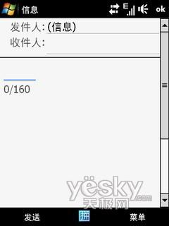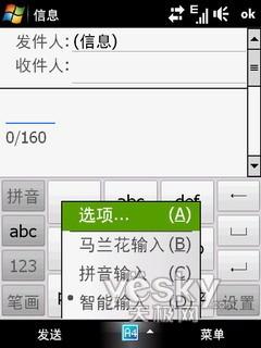 Pro的短信支持SMS文本短信,MMS彩信和POP邮件,所有的选项都集中在短信界面下,可以对已收到,已发送的短信还有草稿等分类保存。在WM6.1系统下,可以将短信设置为聊天界面,可以将每个单独的联系人的来回短信放在一个界面下,对阅读和短信的连贯性都很有用。