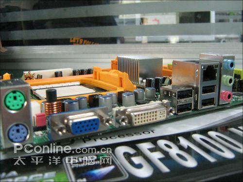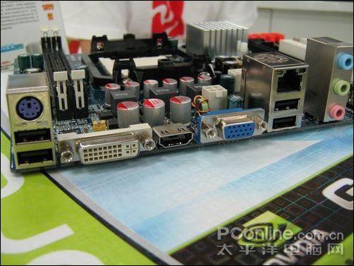 在I\O接口上,这款主板提供串行接口,配备DVI + VGA视频输出接口,多达6个USB 2.0接口,内建RTL 8211B千兆网卡和8声道音频芯片。