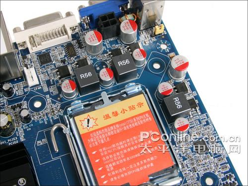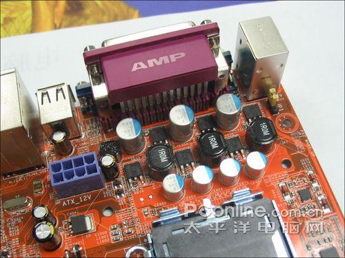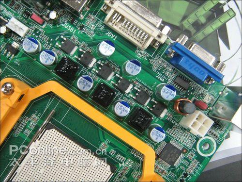 主板采用了3相供电设计,供电部分使用了全封闭式电感搭配固态电容。主板采用全固态电容的设计,整体做工扎实,用料也比较不错。主板的散热系统采用了高端的热管散热,可以有效的将场效应管以及北桥的热量迅速散发,从而保证主板的稳定运行。