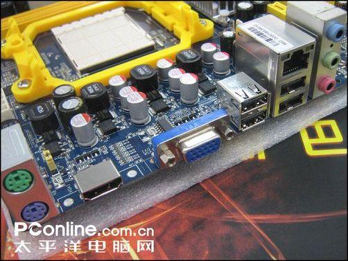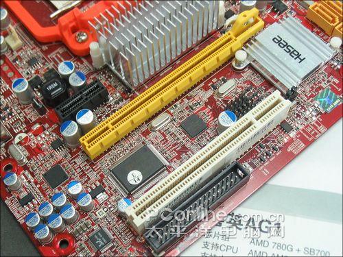 扩展方面,该主板提供了一条支持PCI-E 2.0规范的PCI-E 16X显卡插槽,当采用规定的AMD独立显卡后支持和主板的HD3200集成显卡组成混合交火,另外主板还提供有两条PCI插槽供使用者扩展。