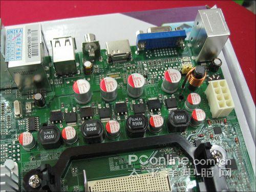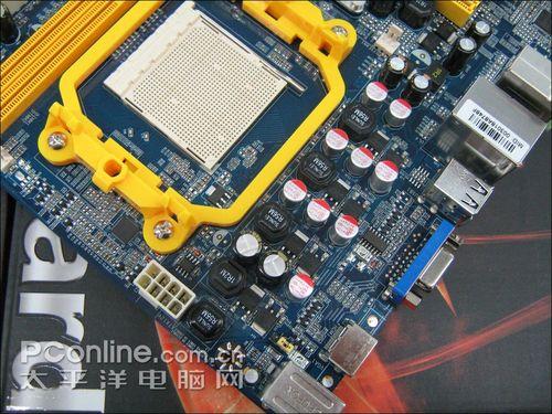 精英 GF8100VM-M3主板采用4相供电设计,每相对应3个MOS管,使用全封闭电感和日本化工固态电容保证了CPU供电的稳定。