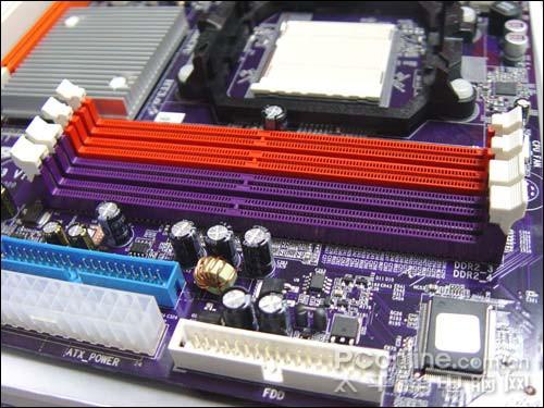主板配备了2条DIMM内存插槽,可支持DDR2 667、800双通道内存规格。