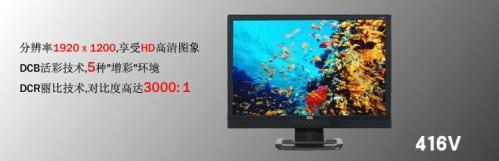 在基本性能参数上,AOC 416V采用16:10黄金视觉比例的16.7M 8-bit色彩优质面板,标准分辨率为1920×1200,亮度为300cd/m2,可视角度为160度/160度,总体来看,416V 的性能指标在众多24英寸宽屏液晶中当属佼佼者。AOC 416V所具备的高清HD显示效果很大程度上能够满足图表设计师和医疗等专业领域应用,其高参数和优质显示效果在办公用途中也同样优秀。
