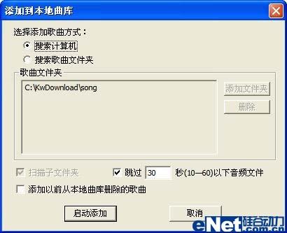 打开酷我音乐盒后,切换到“本地曲库”窗口。点击“添加”按钮打开“添加到本地曲库”对话框,选中“搜索计算机”选框,在下方勾选“跳过30秒以下音频文件”选框(以避免收录无效或错误的音乐文件),点击“确定”按钮,软件就会自动对全盘进行搜索查找,将符合条件的音乐文件全部找出来导入到软件曲库中,稍候在“本地曲库”列表中即可看到本机中全部的音乐文件,自己都收藏保存了哪些歌曲就一目了然了。