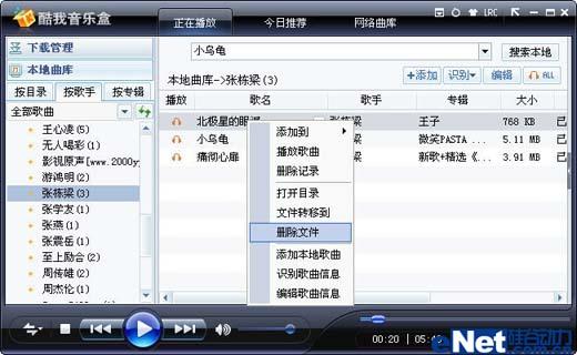 经过以上两步后,你电脑中的音乐文件就全部整理好了。软件会根据音乐文件信息自动进行分类操作。在左侧的“本地曲库”列表中会按照“按目录”、“按歌手”、“按专辑”将歌曲自动分类,方便你快速管理同一类型的音乐文件。比如周杰伦的歌曲都会自动归类到“周杰伦”分类下,即使这些歌曲文件分散在不同的文件夹中,在这里仍可以进行集中管理,用右键单击歌曲名称即可直接进行创建播放列表、打开文件目录、文件移动和删除等操作,管理音乐非常方便。