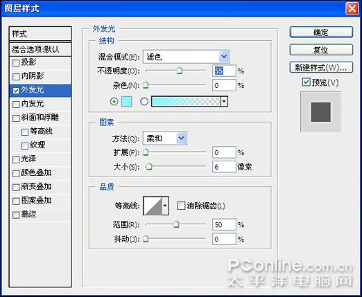 16、单击添加图层样式按钮,在弹出的菜单中选择"外发光"命令,设置弹出的对话框如图26所示,设置"外发光"对话框中的色块的颜色值为86f6ff。得到如图27所示效果。