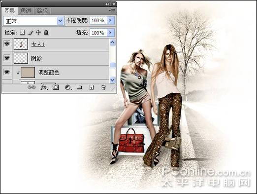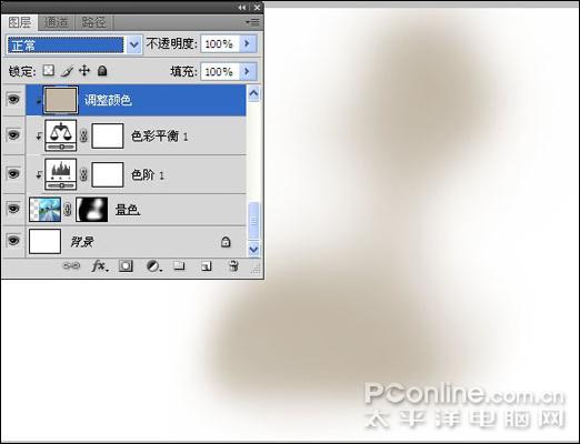 5、新建一个图层,将图层命名为"调整颜色",设置前景色的颜色值为C3b8a8,按Alt+Delete键填充前景色,按Ctrl+Alt+G键应用"创建剪贴蒙版"操作,得到如图11所示效果,设置"调整颜色"图层的混合模式为"颜色",得到如图12所示效果: