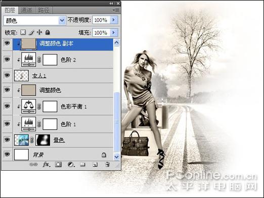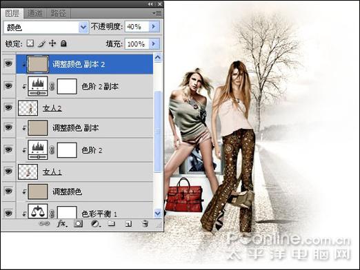 10、将"色阶2"以及"调整颜色 副本"复制到"女人2"的上面得到"色阶2副本"和"调整图层 副本2",并通过应用"创建剪贴蒙版"操作将复制的两个图层剪贴到"女人2"上,得到如图19所示效果。