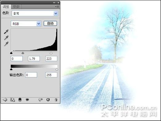 3、单击创建新的填充或调整图层按钮,在弹出的菜单中选择"色阶"命令,设置弹出的对话框如图5所示,单击"确定"按钮退出对话框的同时得到图层"色阶1"按Ctrl+Alt+G键应用"创建剪贴蒙版"操作,得到如图6所示效果。