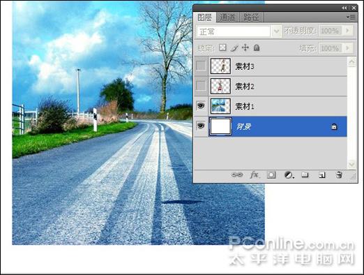 1、打开"素材",这时候打开图层"调板"如图1所示,显示"素材1",并将其重命名为"景色",使用移动工具将其摆放在画布的右侧,如图2所示。