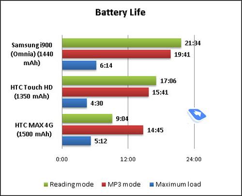 在与三星i908和HTC Touch HD的续航时间对比之中,三者都进行阅读(小亮度看电子书)、MP3播放、视频播放续航时间对比方面,HTC MAX 4G的1500毫安时电池虽然最大,但是续航时间最短,特别是阅读模式下,真是让人大跌眼镜。