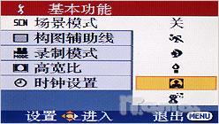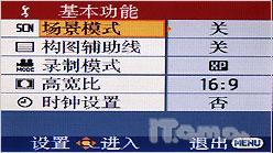 在基本功能菜单中,可以对图片的质量,图片的尺寸,甚至闹钟设置。其内置的场景模式包括运动/肖像/低照度/聚光灯/海滩和雪景六种,对于一般用户来说足以应付一般的拍摄所需。不过要场景模式并没有单独设计按键进入,要在带菜单栏中进入,相比其他有场景快捷键的摄像机来说显得有点复杂。