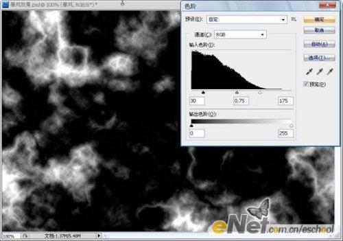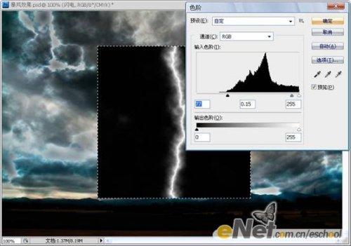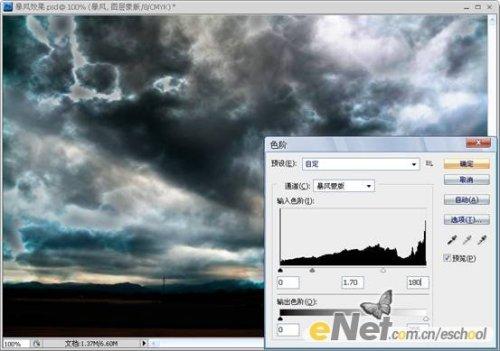 第七步:对【暴风】图层的蒙版执行【图像—调整—色阶】命令,参数设置及效果如下图所示。