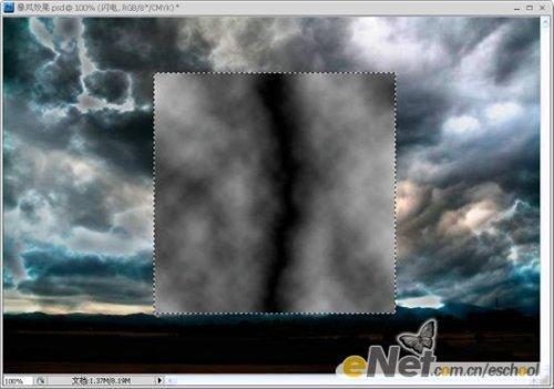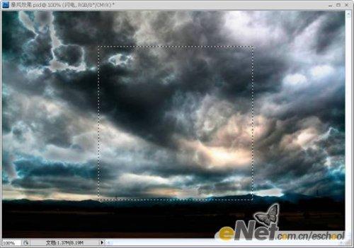 第八步:现在我们的“暴风雨”效果基本制作好了,下面我们再为其添加一些闪电。首先创建一个新层,并命名为【闪电】。在工具箱中选择【矩形选框工具】,按住【Shift】键不放,拖动鼠标制作一个如下图所示的正方形选区。