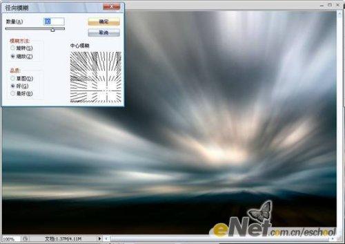 第二步:将【图层 1】复制一层,得到【图层 1 副本】。对【图层 1 副本】执行【滤镜—模糊—径向模糊】命令,参数设置及效果如下图所示。
