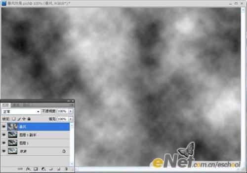 第三步:点击图层调板下方的【创建新图层】按钮,新建一层,并命名为【暴风】。执行【滤镜—渲染—云彩】命令。