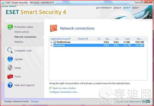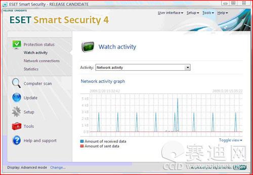 ESET NOD32安全套装 4.0 RC版沿袭了3.0的界面风格。但与3.0版本不同的是,在右侧Protection status(防护状态)菜单下增加了3个子项——watch activity (活动监视)、Network connection (网络连接)和Statistics(统计)。这些项目提供您文件系统和网络的运行状的详细信息,以及ESET NOD32安全套装的活动情况,使得用户对于系统的状况了如指掌。