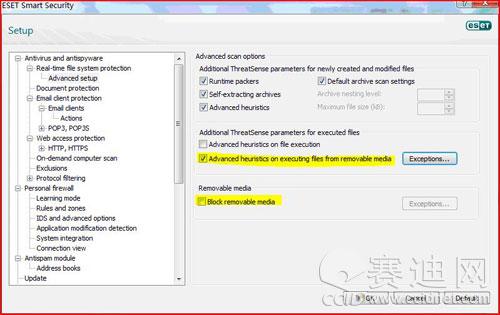U盘、存储卡、移动硬盘等移动存储设备为我们的工作和生活带来了便利,但是可移动存储设备的使用也为了各种病毒、木马提供了可趁之机。由于可移动存储设备的擦写性,各种恶意软件能够很轻易的在人们使用可移动存储进行数据交换时在不同的电脑之间传播。特别是对于那些没有安装光驱而又需频繁使用U盘的笔记本电脑来说,就更加危险。而在ESET NOD32 安全套装4.0 RC中,专门提供了针对可移动存储设备的设置。通过“从可移动存储设备上运行文件时采用高级启发式扫描”选项,ESET NOD32可以在病毒试图通过“自动运行”激活时进行拦截,从而保护您的安全。而“禁用移动存储”选项则可以禁止在您电脑上某个或某几个USB端口上连接移动设备。