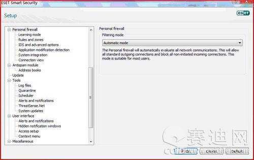 随着3G的商用和Wi-Fi的普及,越来越多的笔记本用户选择将无线上网作为首选的接入方式。然而,由于无线网络的开放性,其比有线网络更加容易受到入侵和攻击。防火墙作为系统安全的重要环节,在无线网络中也就显得尤为重要。ESET NOD32 4.0 RC集成了双向智能防火墙,不论用户使用有线网络中还是无线网络,它无需任何干预就能让用户能得到始终如一的保护。不仅如此,ESET NOD32 4.0 RC的防火墙进行了很大改进,其兼容性不但更好,还增加了两种全新的工作模式——学习模式和包含排除的智能模式,使用户能够更加灵活对其进行配置,满足各种不同的需求。