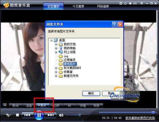 首先要把展示的图片都收集起来,存放到同一个文件平中,比如把图片都存放到“漂亮图片”文件夹中。然后打开酷我音乐盒,切换到“正在播放”窗口,在下方单击“照片”按钮会打开“浏览文件夹”对话框,找到“漂亮图片”文件夹,选中它,点击“确定”按钮即可将该文件夹里的全部图片都导入到软件中了。