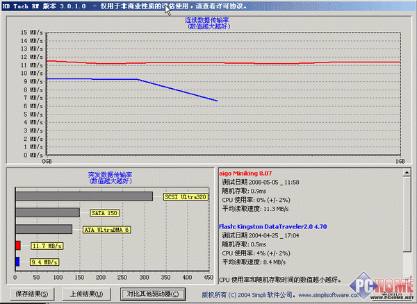 其中红色线条就是代表你的设备的读取速度(如果进行了写入测试,则会用褐色线条来显示),左下方柱状图是你的设备测试结果与其他设备的比较,右下方 测试结果的文字说明。如果,还想跟某具体的存储设备进行对比的话,可以点击“对比其他驱动器”,在随后的对话框中选择你需要对比的驱动器,确认后就可在测 试结果图形界面上显示对应设备的测试数据。
