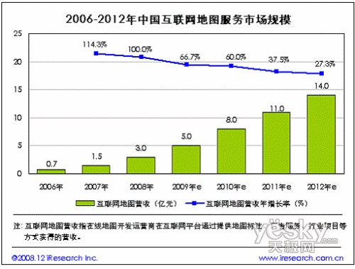 各种行业应用的需求增长给整个在线地图带来了高速增长,艾瑞研究发现:互联网地图服务市场规模08 年翻番,随着互联网地图用户覆盖率的高增长,以及传统企业对在线地图管理系统的意识加强,使得行业项目营收成为在线地图开发运营商的主要收入来源,市场得到迅猛发展,达3 亿元。