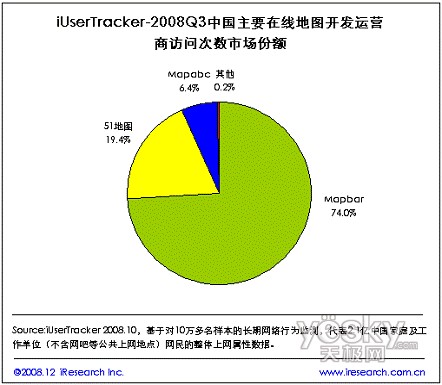 与市场营收格局类似,用户使用量的市场格局也发生了变化。艾瑞研究发现:2008 年中国在线地图开发运营商市场竞争变化明显,根据艾瑞咨询最新推出的网民连续用户行为研究系统iUserTracker的最新数据显示,截止到08Q3,图吧Mapbar 占据访问次数市场份额的74.0%,而51地图占据19.4%,图盟占据6.4%。