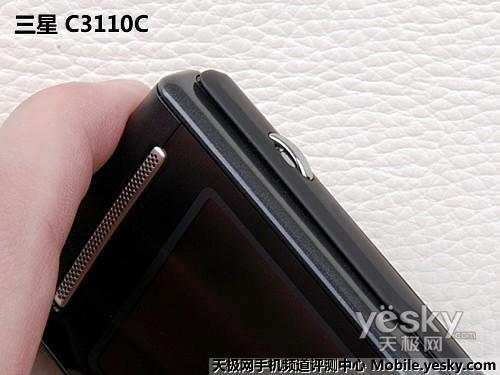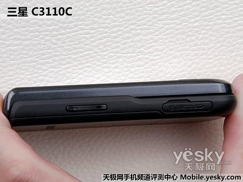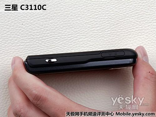三星C3110C机身侧面为黑色,简约大方,除音量调节键外没有设置其他快捷键。左侧下方为存储卡槽,右侧下方是耳机、数据线、充电器三合一接口,需用三星标准接口。