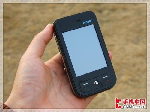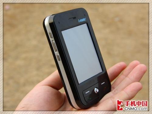 应该说从正面看,i-mate X9000是和主流比较相符的Windows Mobile智能手机,2.8英寸大触控大屏幕,四大功能键配上5方向导航键。但是具体到i-maite 9000会略有不同,首先是其机身厚度给笔者留下深刻印象,确实比较厚,在i-mate 9000的说明书中我没有找到其具体的厚度参数,但通过同和Palm的Treo 680比较来看,其和Treo 680的最厚处相当,由于i-mate X9000是矩形的设计,显得更厚。