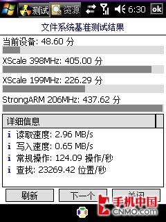 比较可知,i-mate X9000配备的416MHz处理器相比老款XScale处理器在内存和处理速度上都有很大优势,不过在文件系统的测试中分数偏低,出现了较大的偏差。