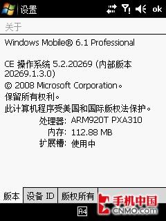 DEC A6在硬件配置方面可谓非常强悍,它采用的是主频为624MHz的Marvell Monohans处理器(ARM920T PXA310),并且标配256MB ROM和128MB RAM,预装Microsoft Windows Mobile 6.1操作系统,开机后可运行内存为112.88MB。