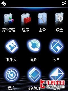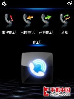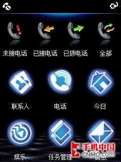 当用户用手指横向或纵向滑动这个立体方块即可实现功能之间的切换,轻触滑块即可进入相应功能页面,在屏幕的上方同时会显示该功能模块下的子模块。与此同时,用户还可以借助于轨迹球上下或左右滑动来完成相应的选择操作。