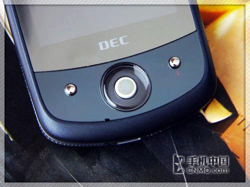DEC A6手机屏幕下方是它的导航键区,按键采用圆形设计非常特别。它并没有配备左软键和右软键,而是只有通话键和挂机键,这样用户在操作时可能会有些许不便。另外,它的导航键用滚珠取而代之,滚珠起到轨迹球的作用,用户滚动圆珠即可实现相应操作。轨迹球为软质磨砂制成,镶嵌在一个弧形凹槽中,当手机倒置时并不会碰到轨迹球,当手机充电时轨迹球还可以透光,发出红色的耀眼光芒。