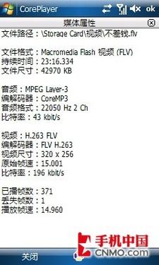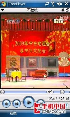 以笔者使用的三星i900为例,在高频CPU以及充裕的RAM空间支持下,可以使用TCPMP轻松的播放帧速为23左右、608×336分辨率的AVI影片,显示流畅,音画同步,并且可以自由拖拽。