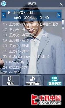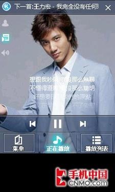 由于屏幕分辨率问题,酷狗播放器在笔者的三星i900上无法全屏显示,另外点击菜单也没有响应,也许是兼容性问题。不过酷狗的界面还是比较炫目的,支持歌词自动搜索,以及歌手图片的显示,相信正式版推出后,会有更好的表现。