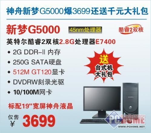 表现至臻至美神舟新梦G5000一直以低调稳重的外观和均衡的高配备受消费者的喜爱,如今新梦G5000的价格下调300元,仅3699元。不仅如此,新梦G5000还升级英特尔45nm工艺双核心处理器E7400,同时配2G DDR-II内存,GT120 512M独立显卡,降价升级后的新梦G5000更具竞争力,为你耀眼呈现,还有千元大礼包赠送!