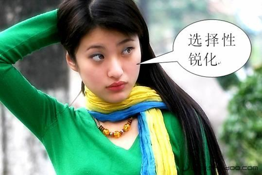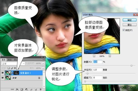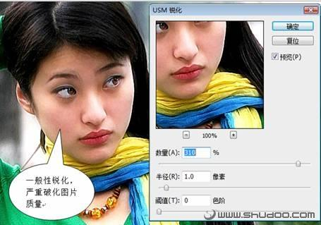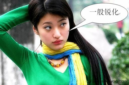 我们使用USM滤镜并采用前面一般性锐化方法中同样的锐化参数对图片进行锐化。我们调整数量至310,半径1.0,阈值为0。此时我们看到图片已经变得清晰一些了,而且MM的皮肤没有像一般性锐化那样出现各种斑点,效果令人满意。但是,图片中部分区域仍然出现了质量损失的问题(图8)。
