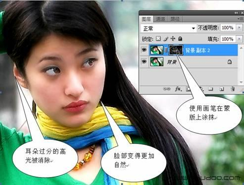 我们在锐化蒙版中对脸部和耳朵过度锐化的地方进行涂抹,过度锐化得到了校正,MM的脸庞变得更加的自然和真实了(图10)。