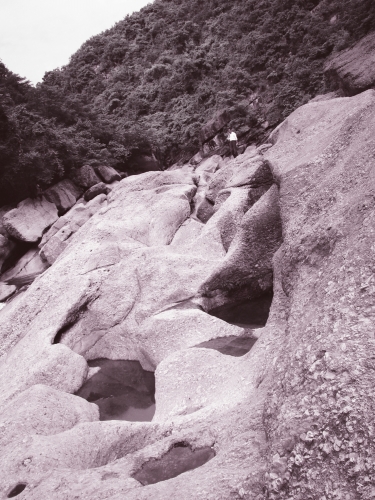 沿着菖溪河,汽车在新近硬化的乡间公路上缓缓前行,20公里的河段内,河中大石愈来愈多,不断有光滑的巨石耸立其间。这些巨石体积庞大,大的有10多米长,六七米宽,三四米高,而且表面无棱无角,如同打磨一般,光滑整洁。