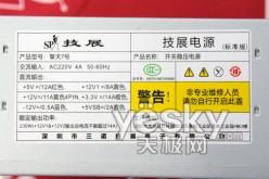 技展擎天7号电源并没有标识所采用的电源版本号,电源提供双路+12V输出,额定功率为230W,通过了3C认证。值得一提的是这款电源采用了12cm风扇,相比于其他品牌的同档次产品有明显的优势。接口方面电源提供24+4pin主电源接口、两个SATA接口、三个D4pin接口和一个软驱接口。